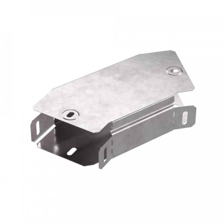 Изготовлен из оцинкованной ленты методом Сендзимира с цинковым покрытием толщиной до 23 мкм, что гарантирует защиту от коррозии и долговечность. В комплект входит крышка, закрывающая соединение и защищающая кабели от внешних воздействий, что облегчает монтаж и последующее обслуживание кабельной системы.