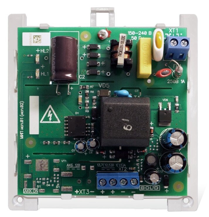Модуль источника питания, 12В, 1А. Расширенный диапазон сетевого напряжения 150-253 В. Возможность подключения аккумулятора от 4,5 до 12 Ач . Компактный пластиковый корпус, не поддерживающий горения