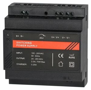Резервированный источник питания с креплением на DIN-рейку; U-вх.190…265 В, U-вых.24…28 В (регулируемое), I-ном.2.5 А, I-max.3 А; I-зар.0.25 А; защита от короткого замыкания, защита аккумулятора от глубокого разряда; t-раб.-20…+50°C, 90х93х56 мм. Цвет черный.