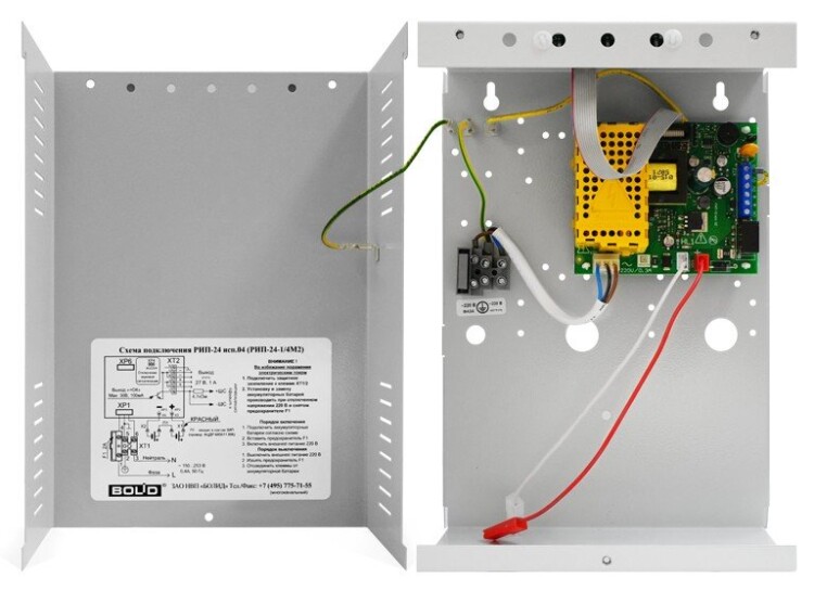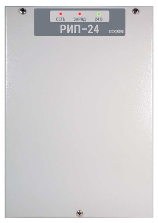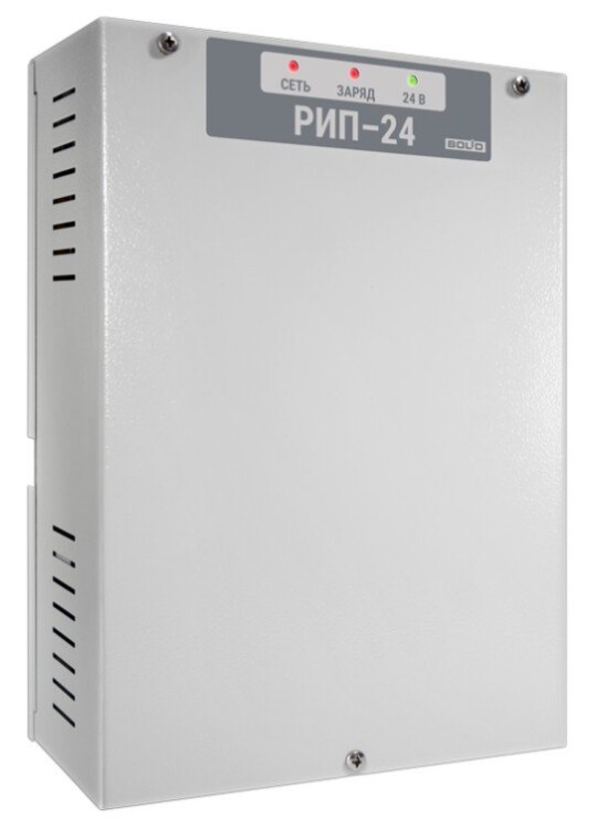 Резервированный источник питания, 24 В, 1 А, с микропроцессорным управлением. Звуковая и световая сигнализация режимов. Возможность установки двух аккумуляторов по 4 Ач. Обеспечивает защиту от переразряда аккумуляторных батарей. Крышка под винт