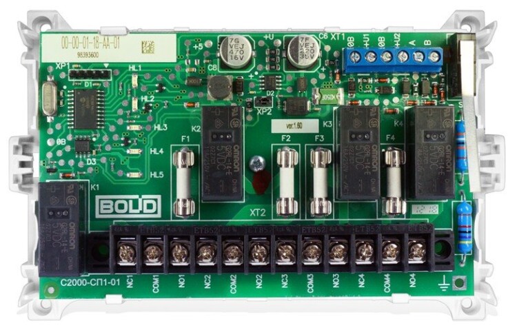 Релейный блок - 4 исполнительных реле с переключаемыми контактами, 250 В- 10 А. Интерфейс - RS-485. Управление от пульта "С2000" или АРМ