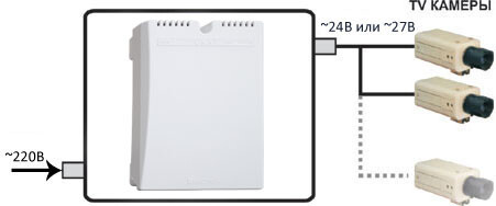 Сетевой (не бесперебойный) источник питания. Выходное переменное напряжение 24 В или 27 В, 50Гц. Максимальный ток выхода - 5А. Выход 27В используется для компенсации падения напряжения на длинной линии