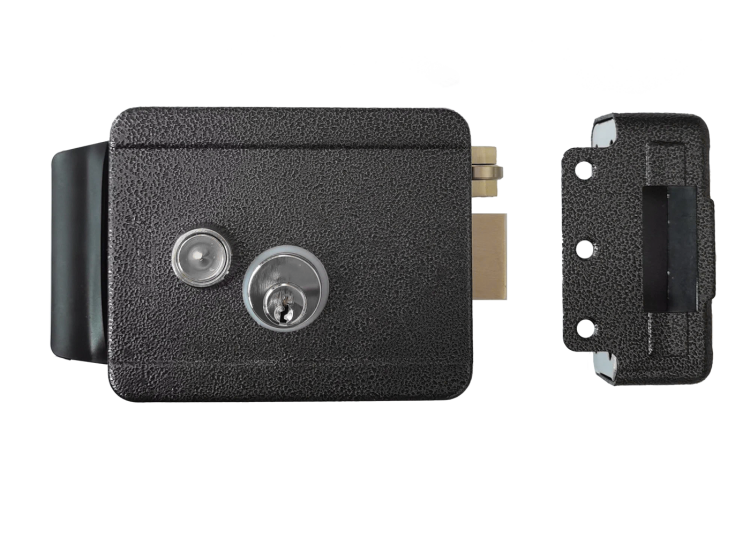 Замок электромеханический накладной, универсальный. Блокировка кнопки открывания. Питание: 12 В, 1,5 А. В комплекте 5 ключей. Рабочая температура: -40...+50°С. Материал корпуса: крашенная сталь.