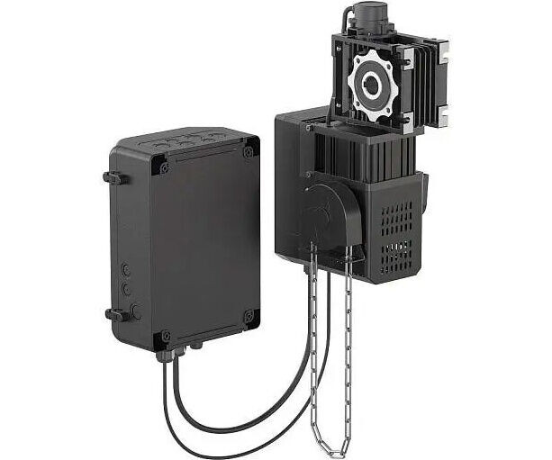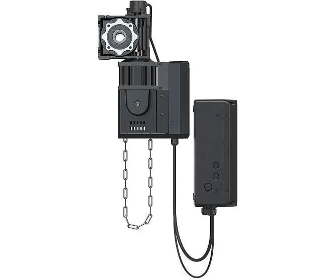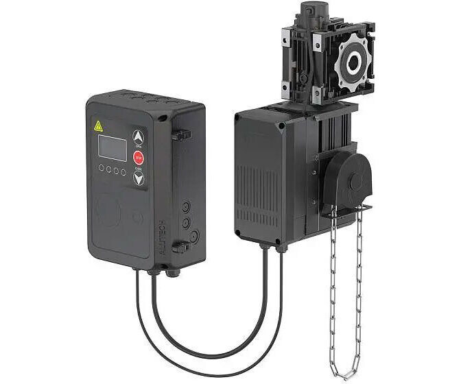 Электропривод с векторным управлением; Внешний блок управления; Кабели подключения (7 м); Цепь аварийного подъема (10 м); Два четырехканальных пульта AT-4L/AT-4N; Монтажный комплект.