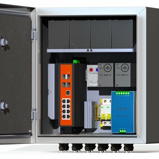 Промышленный неуправляемый коммутатор 8*PoE 802.3 af/at, 2*SFP - 1 шт. Оптический кросс 4 порта SC - 1 шт. Устройство грозозащиты линии 220В -1 шт. Устройство грозозащиты линий PoE -2 шт. Гермовводы 4*PG9, 4*PG13,5 -1 комплект. Цвет ral 7035 (серый)