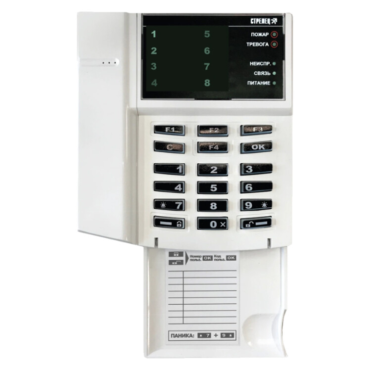 Радиоканальный пульт управления, индикации и контроля сегментом для работы в системе "СТРЕЛЕЦ-ПРО", 8 адресных индикаторов: разделы или группы разделов; 5 статусных индикаторов: "пожар", "тревога", "неисправность", "связь", "питание"; встроенный звук. сигнализатор; дальность радиоканала до 1200 м, f-раб. 868 МГц, элементы питания CR123A 3В (2 шт.), t-раб. -30...+55 °С, IP41, габ.размеры 131x145x30 мм