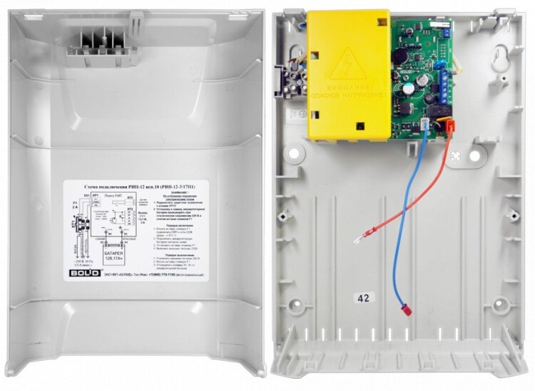 Резервированный источник питания с микропроцессорным управлением, 12 В, 3 А (10 мин-4 А), световая и звуковая индикация режимов, возможность установки аккумулятора17 Ач и внешних до 34 А-ч, защита от переразряда. Пластмассовый корпус