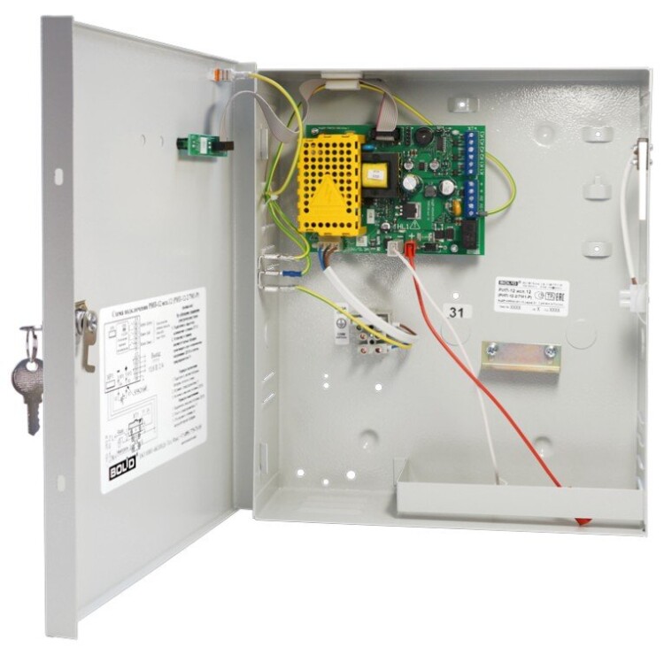 Резервированный источник питания с микропроцессорным управлением, 12 В, 2 А (10 мин-3 А), , емкость 7 Ач (без аккумулятора). Крышка под замок. Соответствие "Техрегламенту пожарной безопасности"