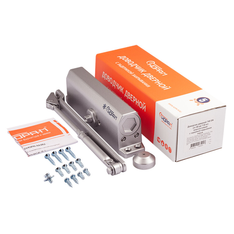 Доводчик с задержкой закрывания двери 740 DA предназначен для установки на двери весом от 60 до 110 кг. Доводчик имеет дополнительную настройку, позволяющую регулировать скорость задержки закрывания двери (DA - Delay Action). Данная регулировка позволяет замедлить закрывание двери в диапазоне от 180 до 65 градусов.