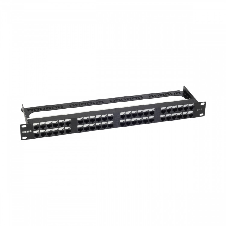 Неэкранированная патчпанель NTSS Premium высокой плотности на 48 портов высотою 1U категории 6 предназначена для монтажа кабелей витая пара в разъем типа Dual IDC с задней части патчпанели и коммутации патчкордами RJ45 с передней части патчпанели. Коммутационная панель выполнена в стандартном размере 19", который является отраслевым стандартом для серверных и телекоммуникационных шкафов и стоек. Оснащена задним кабельным органайзером для удобства монтажа и разводки кабелей внутри шкафа. Использование патчпанелей высокой плотности позволяет увеличить плотность компоновки 19" оборудования.
