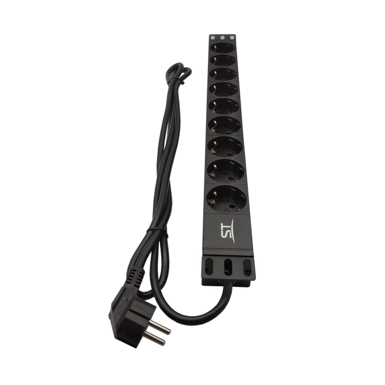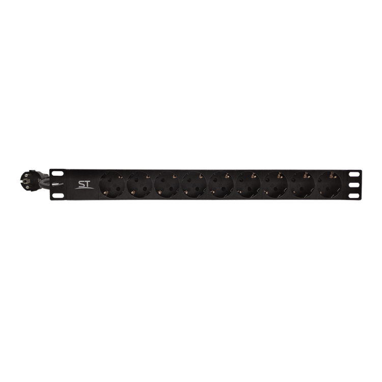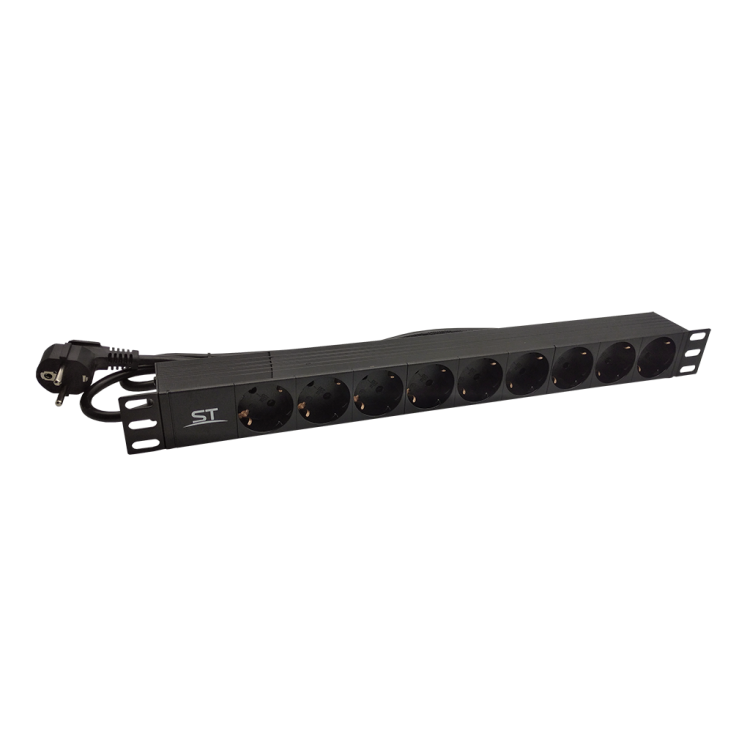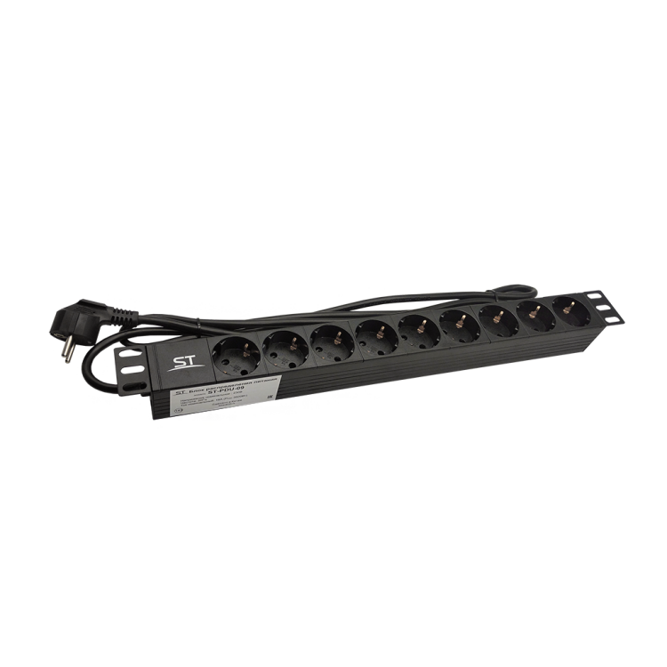 Блок розеток ST-PDU-09, Предназначен для распределения питания однофазных электрических приемников (потребителей) переменного тока напряжением до 250В и частотой 50Гц, Электрическое подключение: Соединительный кабель с разъемом, Тип разъема: вилка CEE 7/7 EF, Длина кабеля: 2 м, Общ количество розеток: 9, Номинальное напряжение: 230 В, Максимальное напряжение: 250 В, 50 Гц, 16 А, 3500 Вт, Сечение жил провода: 1,5 мм?, Защита: Нет, Количество розеток стандарта C2а: 9, Материал корпуса: Пластик, 0…+40