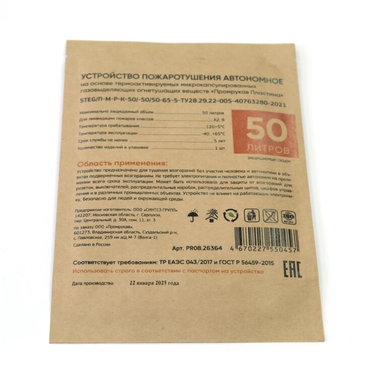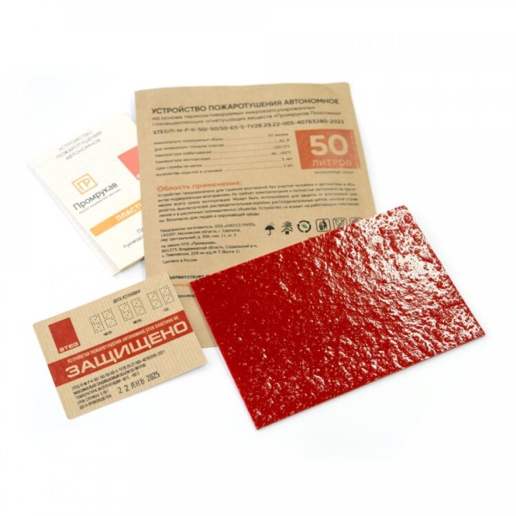 Автономное устройство пожаротушения "STEG Пластина" Промрукав состоит из термоактивируемых микрокапсул с газовым огнетушащим веществом (ФК-5-1-12), заключенных в газопроницаемую полимерную матрицу, и клеящего слоя для крепления пластин. Малые габариты Пластин позволяют установить их в местах наиболее близких к очагу возможного возгорания (подрозетники, контактные группы, скопление проводов, электрооборудование, щитовое оборудование и пр.), предотвращая возникновение и развитие пожара на ранней стадии в объемах до 65 литров. При пламенном воздействии или нагреве Пластин до температуры срабатывания (+120 °C), микрокапсулы разрушаются и импульсно выделяют газовое огнетушащее вещество, которое сбивает пламя, обрывает кинетические цепи процесса горения, создавая среду, не поддерживающую горение, и моментально прекращает пожар в защищаемом объеме.