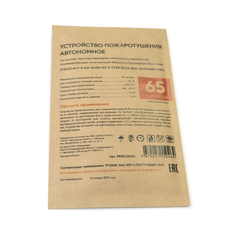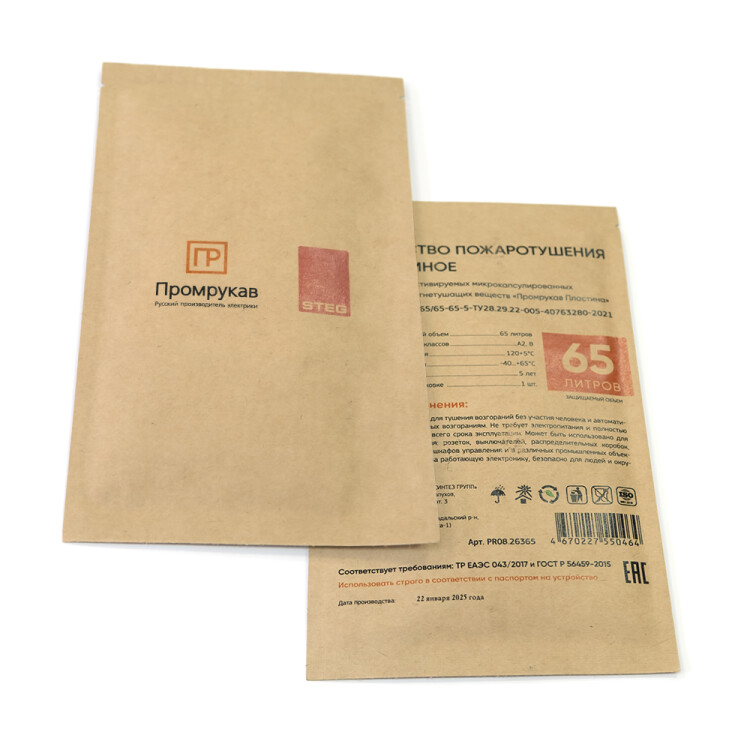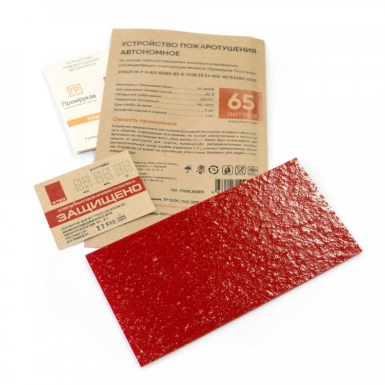 Автономное устройство пожаротушения "STEG Пластина" Промрукав состоит из термоактивируемых микрокапсул с газовым огнетушащим веществом (ФК-5-1-12), заключенных в газопроницаемую полимерную матрицу, и клеящего слоя для крепления пластин. Малые габариты Пластин позволяют установить их в местах наиболее близких к очагу возможного возгорания (подрозетники, контактные группы, скопление проводов, электрооборудование, щитовое оборудование и пр.), предотвращая возникновение и развитие пожара на ранней стадии в объемах до 65 литров. При пламенном воздействии или нагреве Пластин до температуры срабатывания (+120 °C), микрокапсулы разрушаются и импульсно выделяют газовое огнетушащее вещество, которое сбивает пламя, обрывает кинетические цепи процесса горения, создавая среду, не поддерживающую горение, и моментально прекращает пожар в защищаемом объеме.