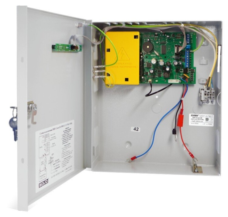 Резервированный источник питания, 12 В, 3 А (2 мин-4 А), передача данных и управление по интерфейсу RS-485, световая и звуковая индикация режимов, возможность установки аккумулятора 17 Ач, защита от переразряда. Крышка под замок. Соответствие "Техрегламенту пожарной безопасности"