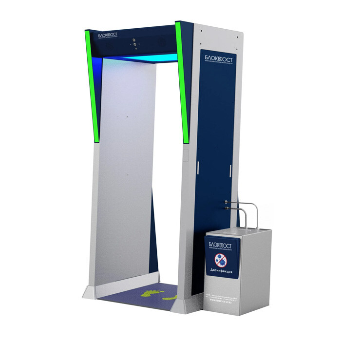 Дезинфекционно-досмотровая станция БЛОКПОСТ КИД-09 М К с подключением к компьютеру (Габариты: 1000х1000х2200 мм). Состав оборудования: кабина дезинфекции, арочный металлодетектор, тепловизионная камера. Ширина прохода - 840 мм. Звуковая и световая индикации, повышенная помехоустойчивость при параллельном размещении, пропускная способность - 60 чел/мин, подключение к ПК. Кабина дезинфекции: время обработки одного человека - 3 сек.; ёмкость бака для дезраствора - 20 л.; количество форсунок - 16 шт. Тепловизионная камера: точность измерения температуры - ± 0.5 °С на расстоянии до 1,5 м.