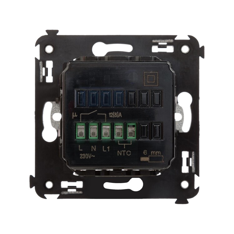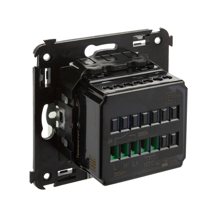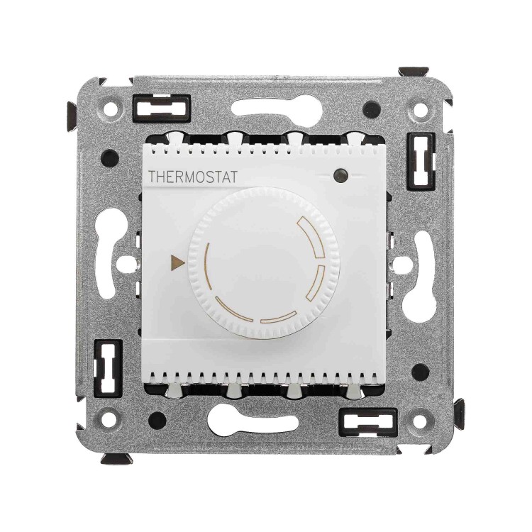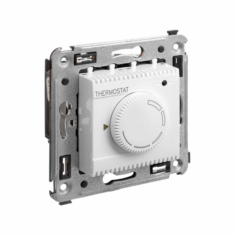 Термостат для теплых полов. Назначение: для монтажа в подрозеточные коробки глубиной не менее 45 мм (код 59301);. Предназначен для управления теплыми полами. Характеристики: диапазон от 5 до 30 °С; частота - 50-60 Гц; номинальное напряжение - 230 В; лампа-индикатор включается, когда температура в комнате падает ниже выбранного значения; нагрузка: 12 A - cos?=1; 4,8 A - cos?=0,4; фиксация в подрозеточные коробки глубиной не менее 45 мм при помощи каркаса с лапками (код 4400802) и саморезов; провод датчика температуры в комплекте (длина 3,5 метра). Цвет: "Белое облако".