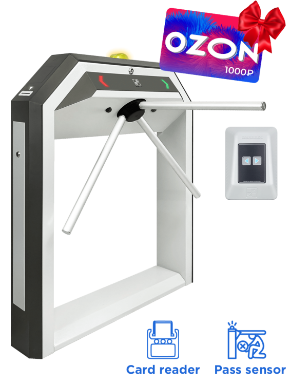 Комплект тумбового турникета со встроенным картоприемником "STR-03KEС"; ширина прохода 500 мм; сигнальная лампа и датчики несанкционированного прохода; 12В DC; 3000 мА; +1...+50°C; IP41; 140х938х1052 мм; 45 кг; в комплекте: тумбовый турникет «STR-03», встроенный картоприемник «KS-03E» со встроенным считывателем формата EM-Marin; комплект преграждающих планок Антипаника «PPA-06R», проводной пульт управления турникетом «TW-02».