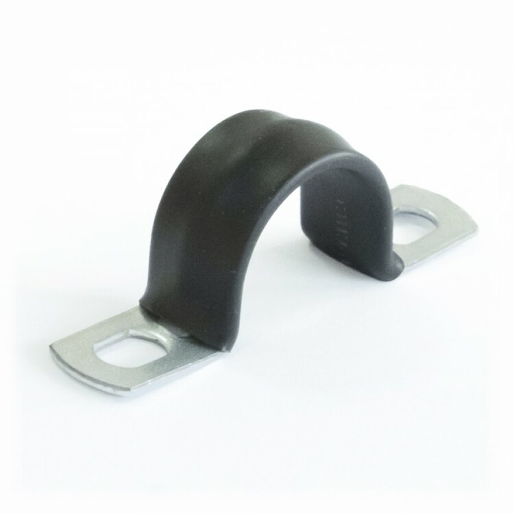 Скоба металлическая двухлапковая с полимерным покрытием для прокладки и крепежа кабельных линий, металлорукавов в ПВХ-изоляции, полимерных и стальных труб.