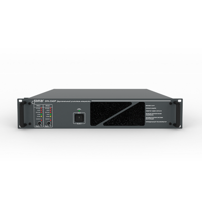 Усилитель мощности трансляционный, выходная мощность 2*240 Вт, с приоритетным и программным входом, защита от КЗ и перегрузки по току, защита от бросков напряжения, подключение дополнительных модулей SFD-200 (контроль линии), потребление 1300 Вт.