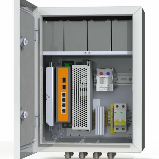 Комплектация: Двухполюсный защитный автомат 6А - 1 шт. Обогреватель 50Вт - 1 шт. Сдвоенный термостат - 1 шт. Блок бесперебойного питания 155Вт -1 шт. Аккумулятор 12В, 7А/ч - 4 шт. Промышленный неуправляемый коммутатор 4*PoE 802.3 af/at (бюджет 140 Вт), 2*SFP - 1 шт. Оптический кросс 4 порта SC/SM - 1 шт. Гермовводы 4*PG9, 4*PG13,5 -1 комплект. Цвет ral 7035 (серый)