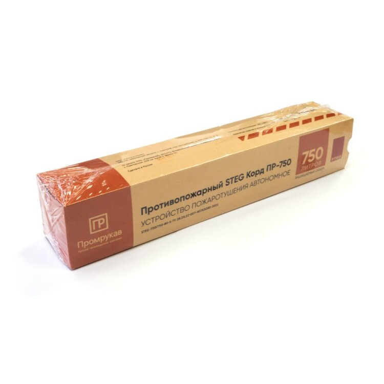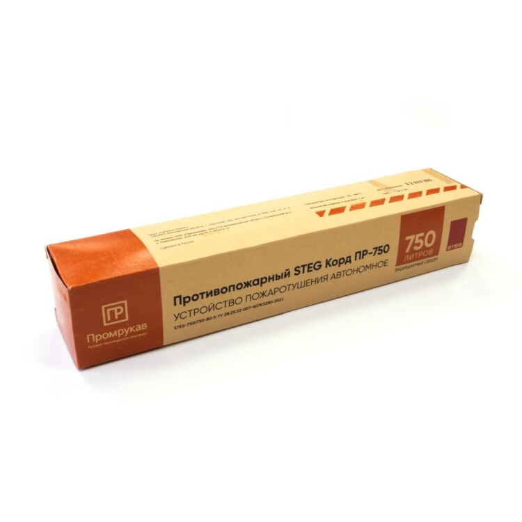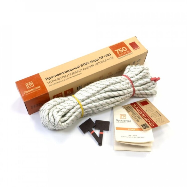 Устройство пожаротушения "STEG Корд" Промрукав состоит из прочной термостойкой оплетки, наполненной термоактивируемым гранулированным огнетушащим составом комбинированного принципа действия. Гранулы включают в себя микрокапсулы с газовым огнетушащим веществом (ФК-5-1-12) и аэрозолеобразующий огнетушащий состав. Гибкость шнура позволяет распределить его в местах наиболее близких к очагу возможного возгорания (электротехнические шкафы, контактные группы, скопление проводов, электрооборудование и пр.), предотвращая возникновение и развитие пожара на ранней стадии в объемах до 1 500 литров. При воздействии пламени на Корд или достижении в точке нагрева температуры срабатывания (+160...270 °C), гранулы по всей протяженности корда термически разлагаются и импульсно выделяют комбинированные газо-аэрозольные огнетушащие вещества, которые сбивают пламя, резко снижают температуру, на химическом уровне разрушают цепи горения, создавая среду, не поддерживающую горение, и за несколько секунд полностью прекращающую пожар в