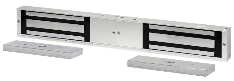 ST-EL500MLD - сдвоенный электромагнитный замок для установки на двустворчатые двери, контролируемые СКУД, а также на двери эвакуационных выходов. Он состоит из двух зеркально выполненных частей, каждая из которых удерживает створку в закрытом состоянии при усилиях на отрыв до 500 кг. Датчики Холла, встроенные в обе части электрозамка, позволяют выполнять мониторинг его состояния, специальные релейные выходы обеспечивают информирование о тревоге при попытке взлома устройства, а особая конструкция обеспечивает преодоление остаточной намагниченности. При использовании опциональных адаптеров можно монтировать этот электромагнитный замок на двери, открывающиеся внутрь или наружу, а также выполненные из стекла.