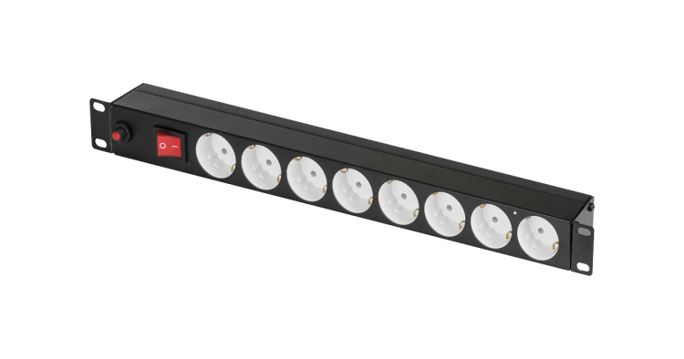 Блок электрических розеток TLK, 19", 8 гнезд "евророзетка", макс. нагрузка 10 А, без шнура питания, вход С14, с фильтром и предохранителем, металлический корпус, макс. мощность 2500 Вт