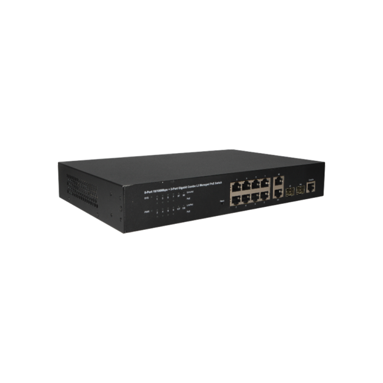 Порты: 8 RJ45 10/100Мбит/с (PoE/PoE+), 2 комбинированных SFP/RJ45 10/100/1000Мбит/с (uplink); мощность PoE: порты 1~8 до 30Вт, суммарно до 120Вт; Коммутационная ёмкость: 5.6 Гбит/с; Скорость коммутации пакетов: 4.17 Мпак/с; Буферная память: 4.1 Мбит; Управление: L2; питание: 100-240В(AC)