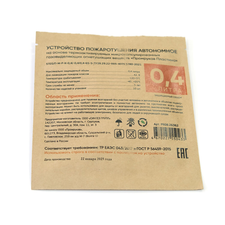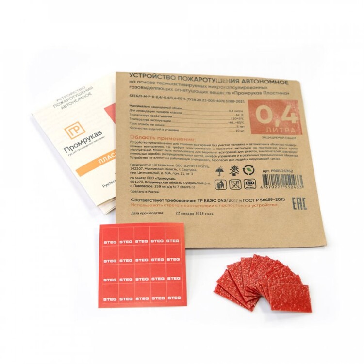 Автономное устройство пожаротушения "STEG Пластина" Промрукав состоит из термоактивируемых микрокапсул с газовым огнетушащим веществом (ФК-5-1-12), заключенных в газопроницаемую полимерную матрицу, и клеящего слоя для крепления пластин. Малые габариты Пластин позволяют установить их в местах наиболее близких к очагу возможного возгорания (подрозетники, контактные группы, скопление проводов, электрооборудование, щитовое оборудование и пр.), предотвращая возникновение и развитие пожара на ранней стадии в объемах до 65 литров. При пламенном воздействии или нагреве Пластин до температуры срабатывания (+120 °C), микрокапсулы разрушаются и импульсно выделяют газовое огнетушащее вещество, которое сбивает пламя, обрывает кинетические цепи процесса горения, создавая среду, не поддерживающую горение, и моментально прекращает пожар в защищаемом объеме.