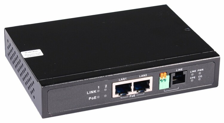 TR-IP2PoE Удлинитель Ethernet (VDSL) на 2 порта до 3000м с функцией PoE. Соответствует стандартам PoE IEEE 802.3af/at. Автоматическое определение PoE устройств. До 30W на порт. Скорость передачи 90Мбит/с (300м), 56Мбит/с (600м), 30Мбит/с (900м), 16Мбит/с (1500м), 14Мбит/с (2000м), 8Мбит/с (2400м), 5Мбит/с (3000м). 2 режима -клиент(CPE)/сервер(CO) . Вх.-роз. 2.1х5мм(DC48V, 1,8A). Вх./вых.- RJ11(VDSL2)/клеммы(VDSL2)/RJ45(Ethernet)x2. БП DC48V (1,8A) в комплекте.Размеры (ШxВxГ): 137х27х100 мм. Рабочая температура 0...+50 гр.С.