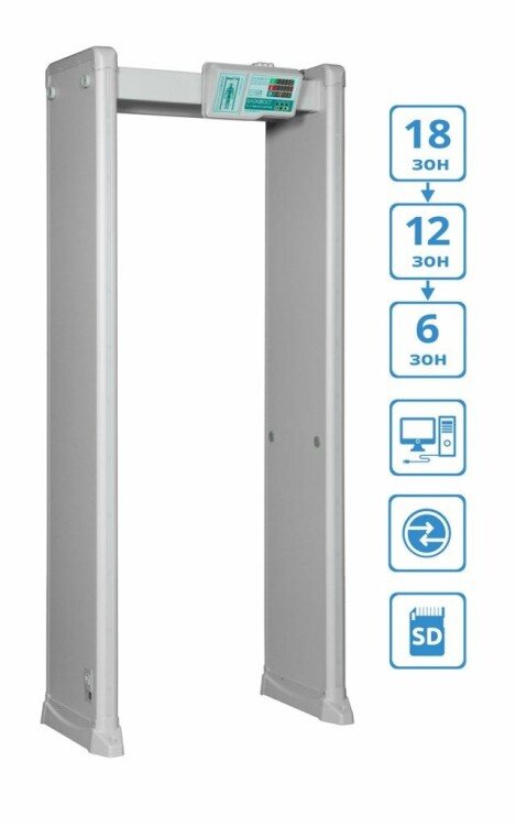 Арочный металлодетектор БЛОКПОСТ PC Z 1800 MK (18/12/6) (Габариты:2230х850х460 мм. Габариты транспортной упаковки: 2270 x 700 x 230 мм). 18/12/6 зон детектирования. Ширина прохода - 750 мм. Звуковая и световая индикации, параллельная эксплуатация (количество рабочих частот) - 50, повышенная помехоустойчивость. Пульт ДУ, "сухие контакты" на плате управления, подключение к ПК, SD CARD. Счетчик проходов, пропускная способность - 60 чел/мин. Пылевлагозащищенное покрытие корпуса, экспортная упаковка.