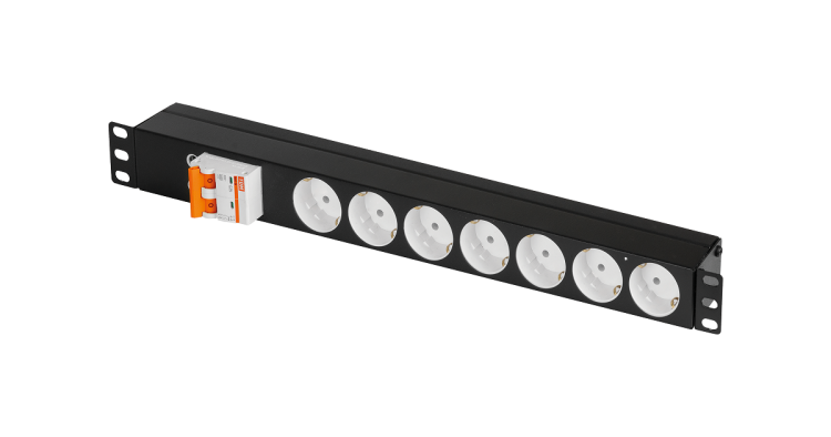 Блок электрических розеток TLK, 19", 7 гнезд "евророзетка", макс. нагрузка 25 А, без шнура питания, вход винтовые клеммы автомат 2P 25A, металлический корпус, макс. мощность 5500 Вт