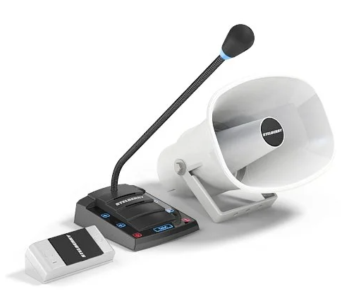 Комплект переговорного устройства клиент-кассир для АЗС с системой громкого оповещения, встроенным усилителем, рупором на 15 Ватт и выходом для записи переговоров. Рупор идёт в комплекте с 15 метрами кабеля. Панель клиента, угловое крепление панели и блок питания в комплекте.
