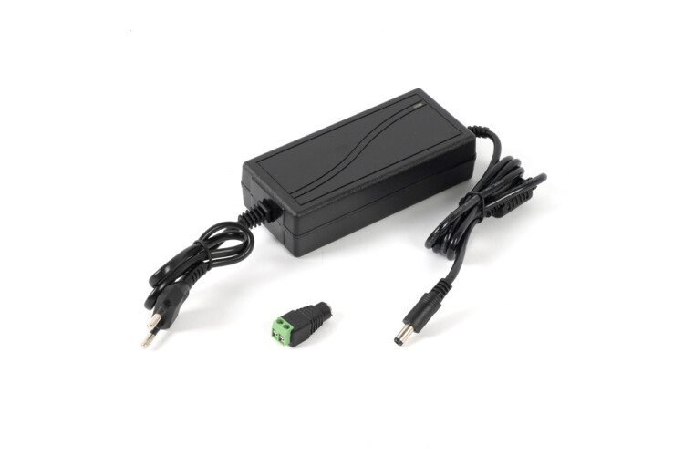 12В, 5А. Напряжение питающей сети 110-245 В переменного тока. Защита выхода от КЗ. Пластиковый корпус IP20. Подключение питания - сетевая вилка, подключение нагрузки - штекер 5,5х2,1 мм, переходник на клеммы в комплекте. Габаритные размеры - 50х30х110 мм.