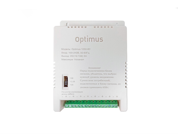 Входное напряжение переменное от 100 до 242 В, частота 50 Гц, Диапазон выходного напряжения 12 - 15В (±5%), при входном напряжении 220В, 50Гц; номинальный выходной ток не более 5А, Мощность 60Вт, 8 каналов, Пластиковый корпус, IP54 (не является влагостойким, для уличного монтажа необходимо использовать специальную монтажную коробку), Рабочая температура От -20С до +45С, 144х110х33мм.