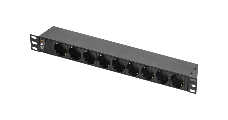 Блок электрических розеток TLK, 19", 9 гнезд "евророзетка", макс. нагрузка 10 А, без шнура питания, вход С14 + предохранитель 10 А, металлический корпус, макс. мощность 2500 Вт, 487,5*44.4*68 мм