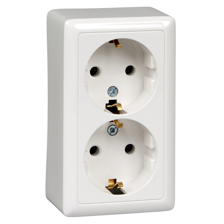 РА16-238-б Розетка (2-х местная, с з/к) Розетка Schneider Electric ХИТ (открытой установки, цвет белый) двойная с заземлением без шторок предназначена для сетей до 250В на ток до 16А. Двойная розетка позволяет подключить два устройства в одном месте. Заземляющий контакт обеспечивает дополнительную защиту от удара электрическим током. При наличии заземления электрический потенциал уходит в землю, защищая человека.