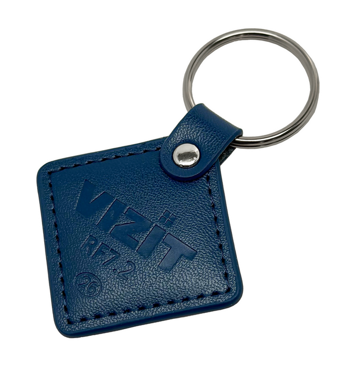 Ключ RF (RFID-13.56 МГц). Кожаный брелок с тиснением логотипа, голубой. Повышенная защита от несанкционированного копирования. Используется совместно с модификациями блоков вызова и контроллеров ключей, имеющих в наименовании литеру "F".