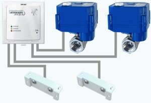Система автоматического перекрытия водопровода и формирования тревожного извещения при обнаружении утечки воды. В комплекте: блок управления - 1 шт., элементы питания CR123A (3В) - 2шт, датчик протечки воды с кабелем 5 м - 2 шт., кран 1/2" с электроприводом - 2 шт.