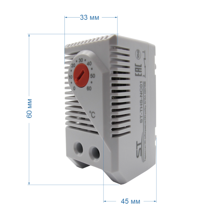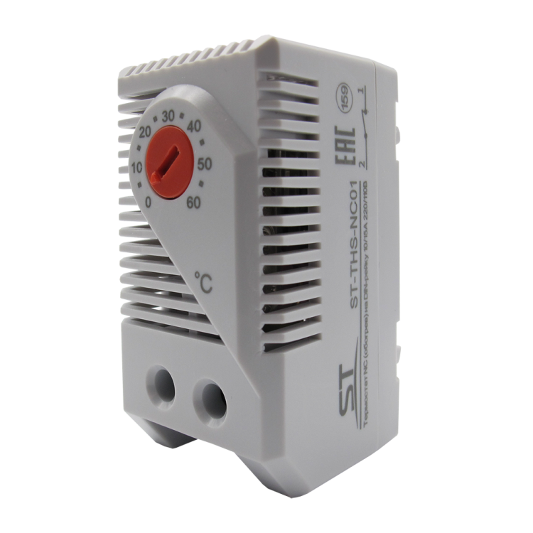 ST-THS-NC01 термостат нормально-замкнутый механический предназначен для поддержания фиксированной температуры и предотвращения образования конденсата, коррозии в корпусных изделиях, клеммных коробках, Номинальное напряжение, В: 110, Номинальный ток контактов: 220В: 10А, Чувствительный элемент: биметаллический элемент, Диапазон регулировки температуры: от 0 °С до +60 °С, Срабатывание при отклонении от установленной °t: 5°С (± 4 °С погрешность), Тип контакта: NC, Тип крепления: на DIN-рейку 35мм, Степень защиты: IP20, Рабочая температура: -20°С - +80°С, Материал корпуса: пластик, Цвет корпуса: светло-серый, Габариты изделия, мм: 60х33х43, Комплектация: термостат, паспорт, упаковочная тара
