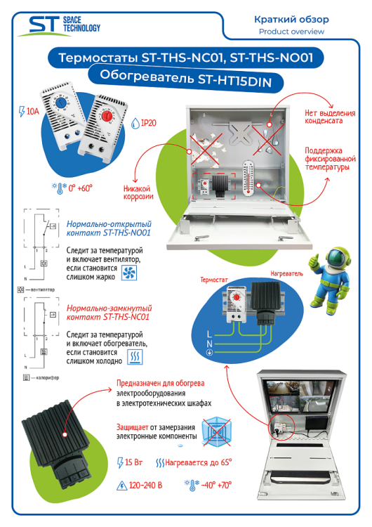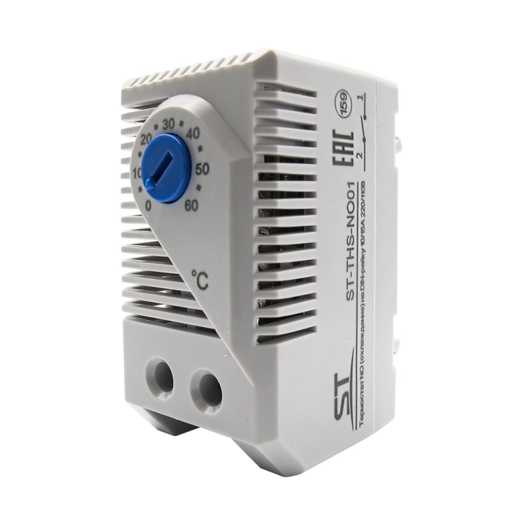 ST-THS-NO01 термостат нормально-открытый механический предназначен для поддержания фиксированной температуры и предотвращения образования конденсата, коррозии в корпусных изделиях, клеммных коробках, Номинальное напряжение, В: 220, Номинальный ток контактов: 110В: 15А, Чувствительный элемент: биметаллический элемент, Диапазон регулировки температуры: от 0 °С до +60 °С, Срабатывание при отклонении от установленной °t: 5°С (± 4 °С погрешность), Тип контакта: NO, Тип крепления: на DIN-рейку 35мм, Степень защиты: IP20, Рабочая температура: -20°С - +80°С, Материал корпуса: пластик, Цвет корпуса: светло-серый, Габариты изделия, мм: 60х33х43, Комплектация: термостат, паспорт, упаковочная тара