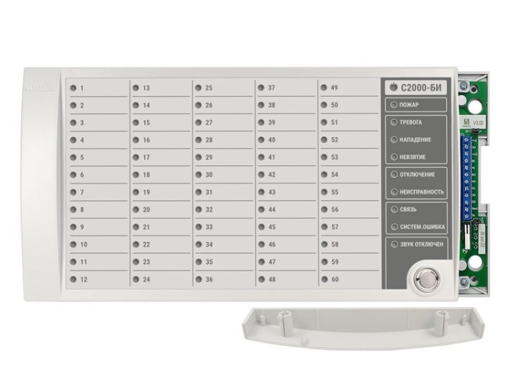 Блок индикации для отображения 60 разделов на двухцветных светодиодных индикаторах и 8 системных индикаторах. Два интерфейса RS-485, питание от 10 до 28 В