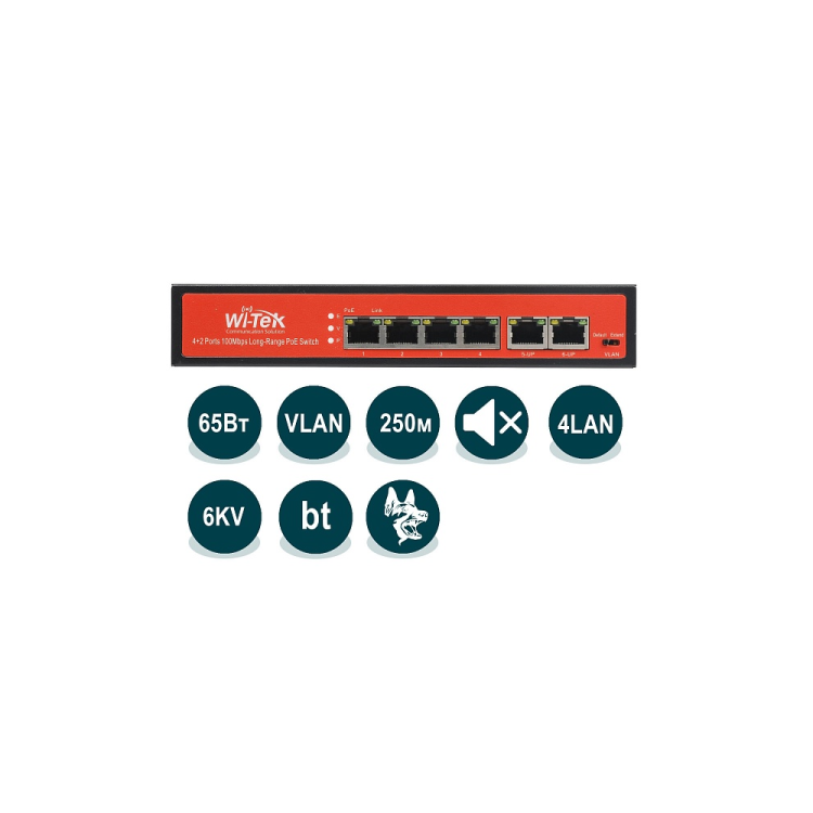 Коммутатор оснащен 6 портами 100Base-TX, из которых 4 поддерживают 802.3af/at (PoE, PoE+)