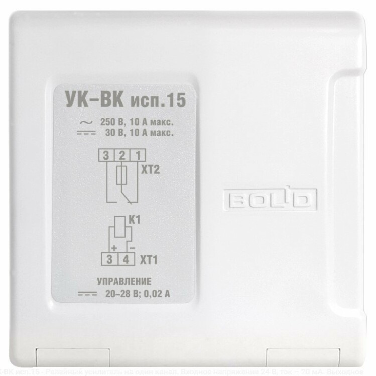 Релейный усилитель на один канал. Входное напряжение 24 В, ток - 20 мА. Выходное напряжение - до 250 В, ток - до 10 А. Контакты на переключение. Возможность крепления на DIN рейку