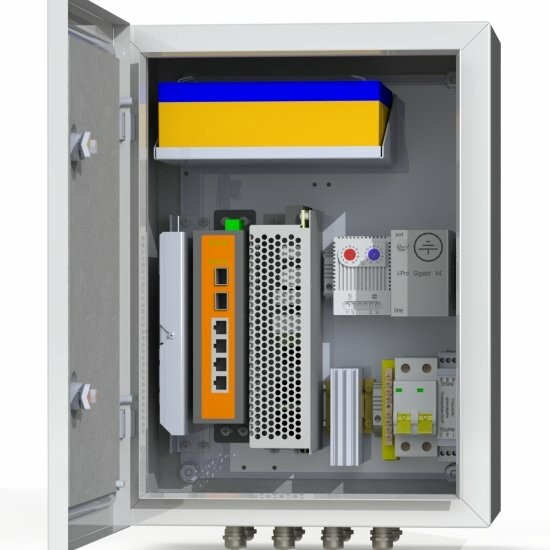 Комплектация: Двухполюсный защитный автомат 6А - 1 шт. Обогреватель 50Вт - 1 шт. Сдвоенный термостат - 1 шт. Блок бесперебойного питания 155Вт -1 шт. Аккумулятор 12В, 2,2А/ч - 4 шт. Промышленный неуправляемый коммутатор 4*PoE 802.3 af/at, 2*SFP - 1 шт. Оптический кросс 4 порта SC - 1 шт. Гермовводы 4*PG9, 4*PG13,5 -1 комплект. Устройство грозозащиты линии 220В -1 шт.