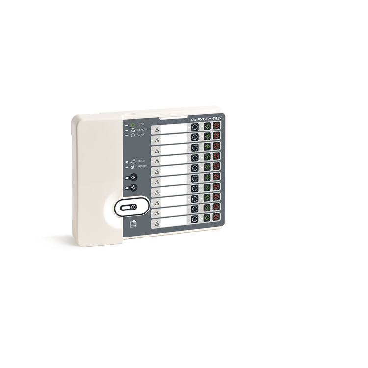 Пульт дистанционного управления - дистанционное управление однимили группой исполнительных устройств (МДУ, РМ, МРО). Технические характеристики: интерфейс: RS485; количество «Рубеж-ПДУ» в одном RS-485 - не более 10 шт; напряжение питания - 10-28В; потребляемая мощность, не более - 7 Вт; число групп исполнительных устройств (направлений) - не более 10; количество ИУ в каждой группе - не более 100.