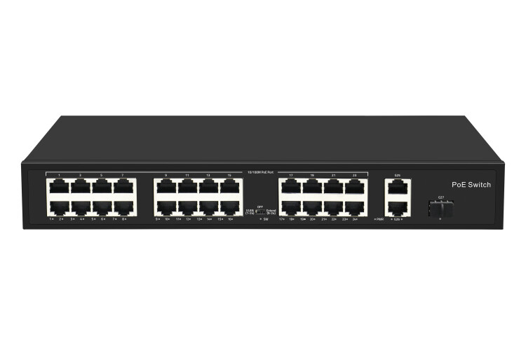 Коммутатор неуправляемый 26 портовый с PoE; 16xRJ-45 100Мб/с портов PoE до 30Вт на порт(af/at); 2x RJ-45 1000 Мб/спорта Uplink; 1хSFP (1000Мбит/с) бюджет PoE 300 Вт; VLAN режим; поддержка режима EXTEND с дальностью связи до 250 м при скорости 10 Мбит/с; AC 100-240 В; 305 Вт; -10...+55?; грозозащита до 4 кВ и защита от электростатического разряда до 8 кВ; 320х207х44мм.