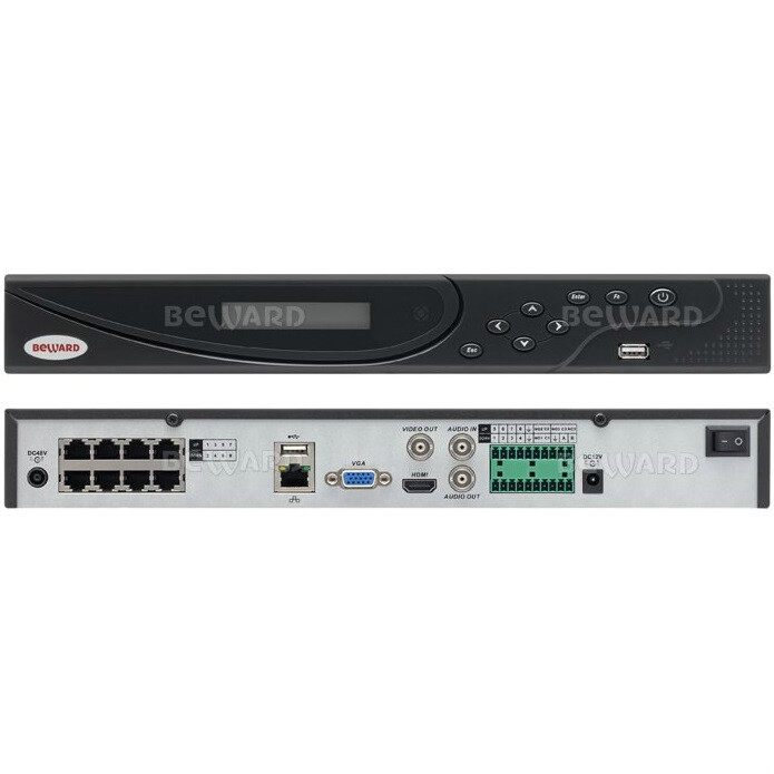До 16 IP-каналов со звуком, 8xPoE, до 96 Мбит/с, 3840х2160 (8 Мп), до 480 к/с, H.265/Н.264, экспорт в AVI, детектор лиц, подключение камер по ONVIF, легкий доступ через интернет (P2P сервис), до 2хSATA HDD 3.5"", мобильный клиент iOS/Android, поддержка облачных хранилищ, VGA (тревожный монитор)