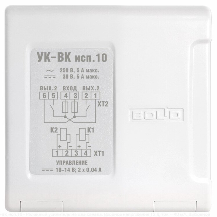 Релейный усилитель на два канала. Входное напряжение 12 В, ток - 40 мА. Выходное напряжение - до 250 В, ток - до 5 А. Контакты на замыкание. Возможность крепления на DIN рейку