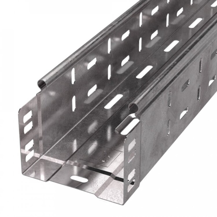 Особенностью конструкции являются продольные ребра жесткости, которые увеличивают устойчивость лотка к изгибу, а перфорированное основание и боковые отверстия обеспечивают хорошую вентиляцию и удобство крепления. Соединение «папа-мама» упрощает монтаж и позволяет быстро собирать длинные участки без дополнительных крепежных элементов. Крышка фиксируется на защелках, что ускоряет обслуживание и замену кабелей без использования инструментов.